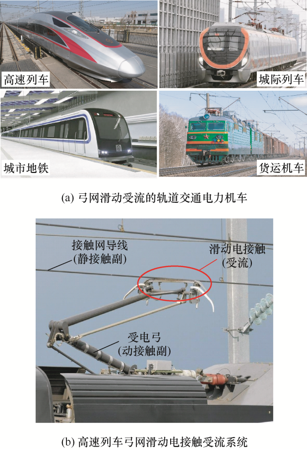 ... 滑动电接触不同于其他的电接触方式,是电接触的一种特殊形式,两接触副相对运动而不分离.滑动电接触状态下,接触副的使用寿命和接触界面间的机械电气特性与接触导体的相对运动速度、接触副材料等密切相关[1].高速列车、城际列车、城市地铁和货运机车等轨道交通电力机车通过滑动电接触方式受流,电力机车运行过程中,受电弓滑板(弓)作为机车获取动力的集电元件,通过直接与接触网导线(网)滑动接触获得电流,供给列车使用,如图1所示.弓网系统作为电力机车获取能量的唯一渠道,其稳定可靠的电接触是保证列车安全运行的前提.而接触副材料是弓网滑动电接触的核心问题,直接影响着弓网电接触系统的可靠运行和电力机车的受流质量. ...