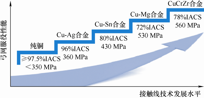... 铜银合金除了铜银材质外还包括铜银锡材质.我国曾在200~250 km/h的线路中普遍使用铜银、铜银锡系列接触导线,研制的Cu-0.04Ag-0.07Sn接触导线抗拉强度和电导率分别达409 MPa和90%IACS[15].铜银和铜锡银合金接触导线虽然导电率和载流量大,但较纯铜接触导线的强化效果不明显,且Ag属于贵金属,成本高,并不适合大范围使用. ...