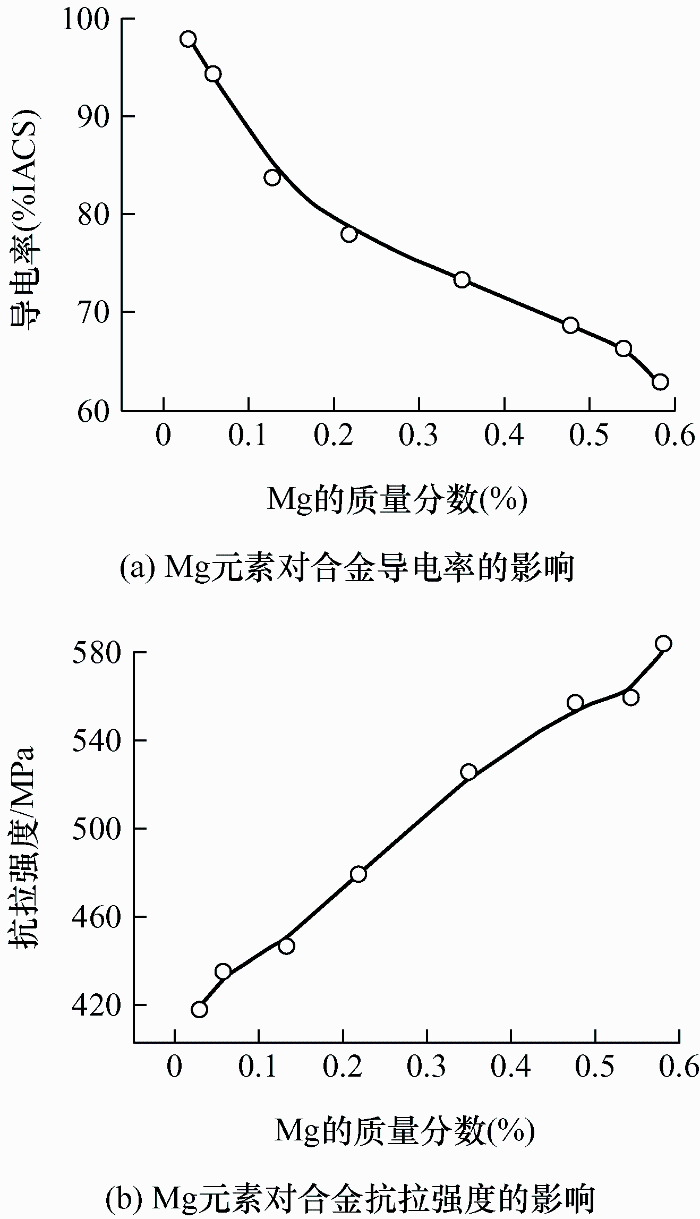 ... 一般地,铜镁合金接触线中Mg含量多维持在0.4%左右,且多采用特殊加工手段以兼顾铜合金高强度、高导电性的重要性能[22],当镁的含量超过0.7%时接触线生产过程中容易发生碎断[23].有研究[17]表明,当Mg元素的质量分数为0.025%时,铜镁接触线的导电率和抗拉强度分别为98.0%IACS和420 MPa,Mg元素的质量分数为0.580%时,铜镁接触线的导电率和抗拉强度分别为63.5%IACS和580 MPa,图4所示为Mg元素对铜镁合金导电率和抗拉强度的影响.对比图3与图4可知,镁元素的含量对铜镁合金导线性能的影响规律与Sn元素对铜锡接触线的影响规律一致.但相同抗拉强度下,铜锡合金的导电率更高,与铜锡合金相比,相同导电率的铜镁合金则可以获得更高的抗拉强度,等含量的Sn元素对合金导电率的影响比Mg小[17]. ...