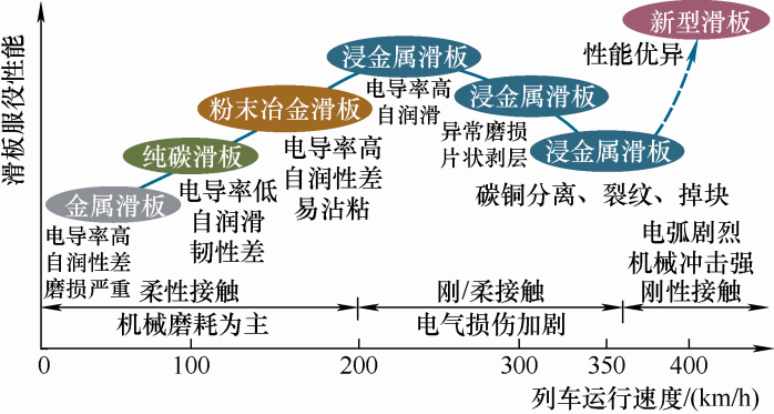 ... 国内外高速铁路发展至今,受电弓滑板均经历了如图5所示的金属滑板、纯碳滑板、粉末冶金滑板、浸金属碳滑板和碳基复合材料滑板等几个发展历程[5].为适应高速铁路的发展,滑板材料已进入多元化的发展阶段,新型滑板材料层出不穷,在保证高导电率的前提下,提高滑板的耐烧蚀、抗冲击以及滑板自身和对接触线的小磨耗是一直以来的研究重点. ...
