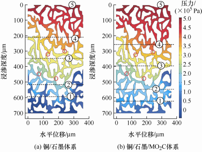 ... [76].为此,引入具有良好湿润性的碳化物以改善碳/铜界面的湿润性,提高金属熔液在碳基体中的浸渍量[77-78].常用的引入湿润性的碳化物方法有两种,一种是通过加入Ti和Cr等元素与预制体发生反应生成具有良好湿润性的TiC和Cr2C3等湿润性碳化物[79],但加入过量钛生成的TiC阻塞C/C上的孔洞,降低了渗透效果[80];另一种是通过在碳基体表面制备具有良好润湿性的Mo2C涂层以更加均匀地浸润铜熔液[81].文献[82]通过有限元数值模拟Mo2C晶粒增强的多孔石墨基体中铜熔体的二维渗流过程,研究了Mo2C晶粒尺寸、体积分数对铜熔体的渗流行为及复合材料气孔率的影响规律,图7所示为铜/石墨体系和铜/石墨/Mo2C体系的浸渗过程中流体的压力场对比,图7中标记的①~⑤分别对应流体压强等于0.1~0.5 MPa的五个点,可以看出经Mo2C改性后驱替压力的平均传递长度约向前推进了30 μm.此外,ZUO等[83-84]通过试验和仿真等手段,研究了活性元素Fe、B改善碳/铜湿润性以及合成的Fe3C、B4C化合物对界面演化的影响机理,制备了力学性能优异的碳/铜复合材料. ...