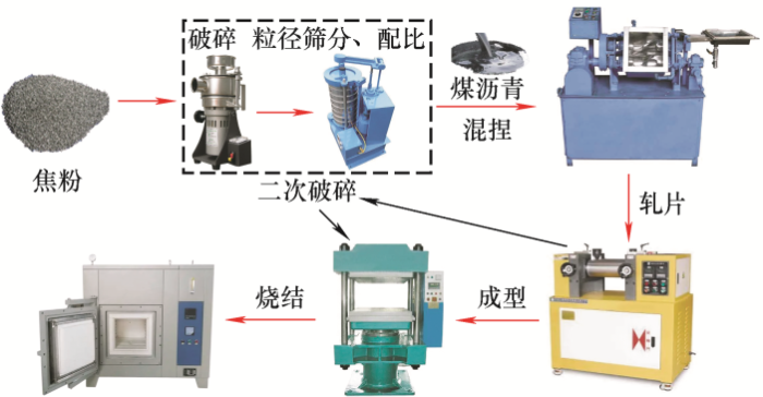 ... 碳纤维具有良好的自润滑性和减磨性能,电导率为1.0×10-3~1.0×10-2 Ω·cm,是优异的增强相材料,在影响材料导电性能不大的情况下可以极大地增强材料的强度,碳纤维复合材料滑板的冲击强度比浸金属碳滑板提高近10倍[85].此外,碳纤维复合材料还具有良好的耐烧蚀性能和耐腐蚀性能.纤维增强受电弓滑板材料的制备工艺主要包括破碎研磨、筛粉、混捏、轧片、液压成型和烧结碳化,制备工艺流程如图8所示. ...