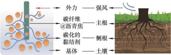 ... 由于碳纤维表面光滑、吸附性能低,具有疏水性和化学惰性,致使碳纤维和基体间的界面粘结性差,严重影响复合材料的综合性能[89].为解决碳纤维/基体界面结合问题,需要对碳纤维表面进行改性.一般有酸性修饰[90]、电化学改性[91]、等离子体表面改性[92]、高能辐射改性[93]和表面吸附/生长纳米颗粒[94]等碳纤维表面改性技术,文献[95]详细综述了碳纤维表面改性技术和碳纤维/聚合物界面粘结方面的研究进展.预氧化碳纤维具有丰富活性官能团,将其引入可显著改善碳-碳复合材料的界面结构完整性,提高复合材料的力学、热学等性能[96-97].此外,有学者借鉴树根仿生学,设计了碳滑板根系互锁结构,制备了具有仿生结构的碳纤维增强碳基复合材料的碳滑板,具有良好的力学、电学和热学性能,抗压和抗折强度分别达到158.33 MPa、36.65 MPa[98],根系仿生结构示意图如图9所示. ...