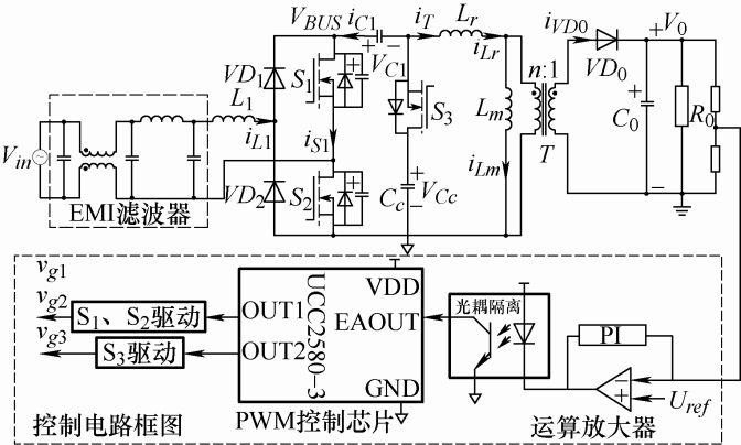 变换器的控制电路仅由运放、光耦和PWM控制芯片构成;将输出电压分压采样后的信号进行PI调节,再将误差信号通过光耦隔离传递到原边控制芯片UCC2580-3,然后控制芯片UCC2580-3输出一组带死区的互补驱动信号OUT1和OUT2,信号OUT1同步驱动主开关管S 1 、S 2 ,信号OUT2驱动辅助开关管S 3 。通过调节两个信号的死区时间来实现开关管S 1 、S 2 和S 3 的ZVS,通过调节漏感Lr 和钳位电容Cc 的值,让其有足够的谐振深度,从而使能量能完全传递至二次侧[23 ] 来实现副边续流二极管VD 0 的ZCS。由图1 可知,所提PFC变换器拓扑仅用一级变换就可以实现AC-DC功能和输入输出隔离,所用元器件数量少,成本低,控制简单。