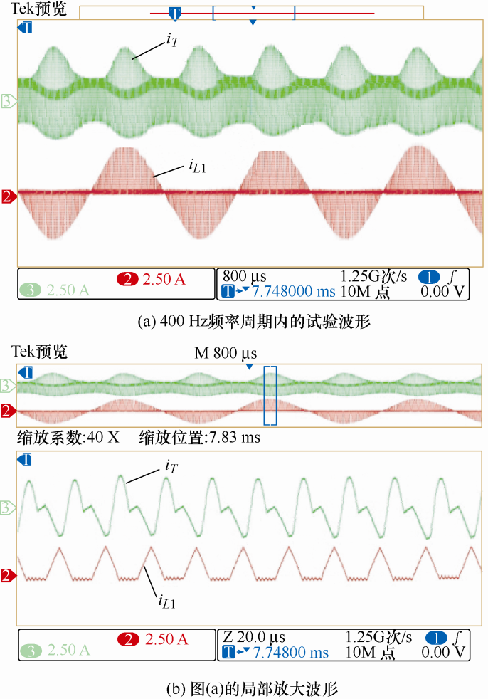 图10 所示为Vrms =115 V时输入电感电流iL 1 和流入变压器的电流iT 的试验波形,图10a 为基于无桥SEPIC PFC变换电路在400 Hz频率周期内的试验波形,图10b 为图10a 在输入电压峰值点附近的局部放大波形。从图10 可以看出,该变换器的输入电感运行在断续模式,输入电感电流的峰值包络为正弦波,漏感Lr 和钳位电容Cc 有足够的谐振深度,能使能量完全传递至变压器二次侧,试验波形与理论分析完全一致。