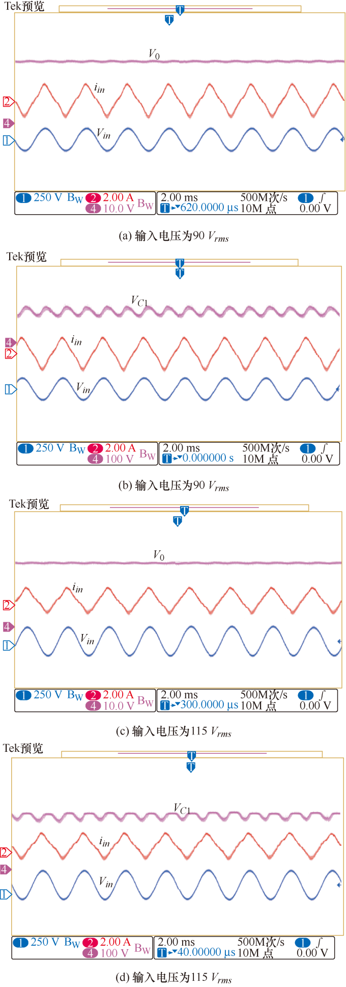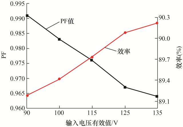 实验室搭建了70 W试验样机,试验结果表明了所提变换器的合理性和可行性;在有效值90~135 V 的交流输入电压下,其功率因数高达0.991,效率高达90.22%,验证了理论分析的正确性。