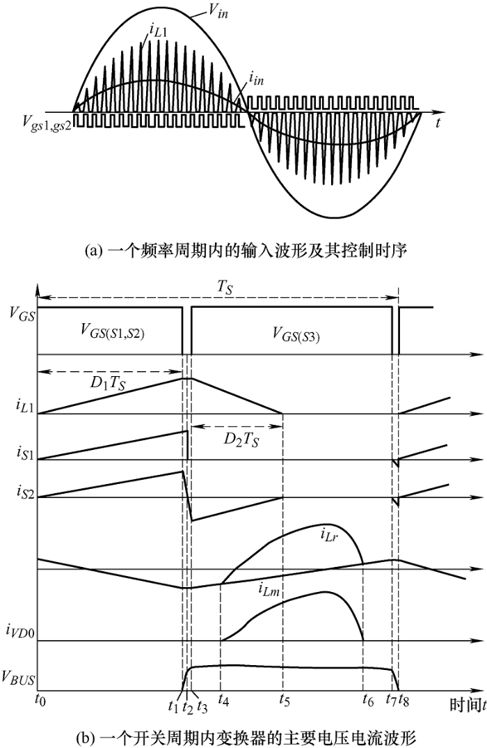 该变换器输入电感L 1 的电流工作在DCM模式,如图2a 所示。由于电路正负半周原理相同,现以输入电感电流工作在正半周断续导电模式来介绍电路的工作原理。假设输入电压Vin =Vm sin(ωt )为理想正弦波,其中Vm 为输入电压Vin 的峰值,ω 为输入电压Vin 的角频率。为了便于分析,假设如下:VDS 1 、VDS 2 分别为开关管S 1 、S 2 的体二极管,CS 1 、CS 2 分别为开关管S 1 、S 2 的寄生电容,VDS 3 为开关管S 3 的体二极管,输出电容C 0 足够大;Lm $\gg $ Lr ,开关管的开关频率fs 远大于输入交流电压频率fg 。
