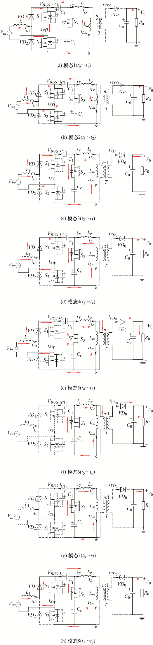 该变换器的关键电压和电流波形如图2 所示,图2b 对应的工作模态分析如图3 所示,相关元器件电流的正方向已在图1 中标出。