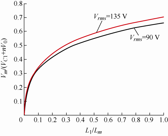 从式(24)可知,中间电容电压VC 1 的大小与变压器匝数比n 、输出电压V 0 、输入电压峰值Vm 以及励磁电感Lm 和输入电感L 1 的比值相关;当变压器匝数比n 和输出电压V 0 、输入电压一定时,中间电容电压VC 1 与励磁电感Lm 和输入电感L 1 的比值呈非线性函数关系,其关系曲线如图5 所示。根据图5 可得,对于28 V输出,n =3.3时,当输入电压确定时,随着L 1 /Lm 比值逐渐增大,Vm /(VC 1 +nV 0 )的值逐渐增大,中间电容电压VC 1 逐渐减小,因此,可以通过合理设计励磁电感Lm 和输入电感L 1 的值,来确定中间电容电压VC 1 。