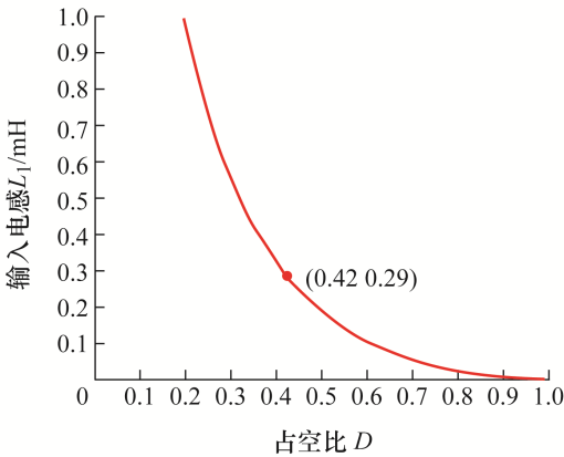 根据式(18),对于28 V输出,n =3.3时,得出不同占空比D 和输入电感L 1 的关系,如图7 所示。在最低输入电压下,得到占空比D =0.42,对应L 1 =290 μH,确保变换器工作在DCM模式,在实际电路中取L 1 =250 μH;综合考虑变换器功率因数和中间电容电压VC 1 ,结合图4 与图5 ,取Lm =300 μH;同时,由图4 和图5 折中考虑,可以计算得到中间电容电压在输入电压有效值为90 V、115 V、135 V时的大小分别为153.3 V、197.3 V、225.7 V。