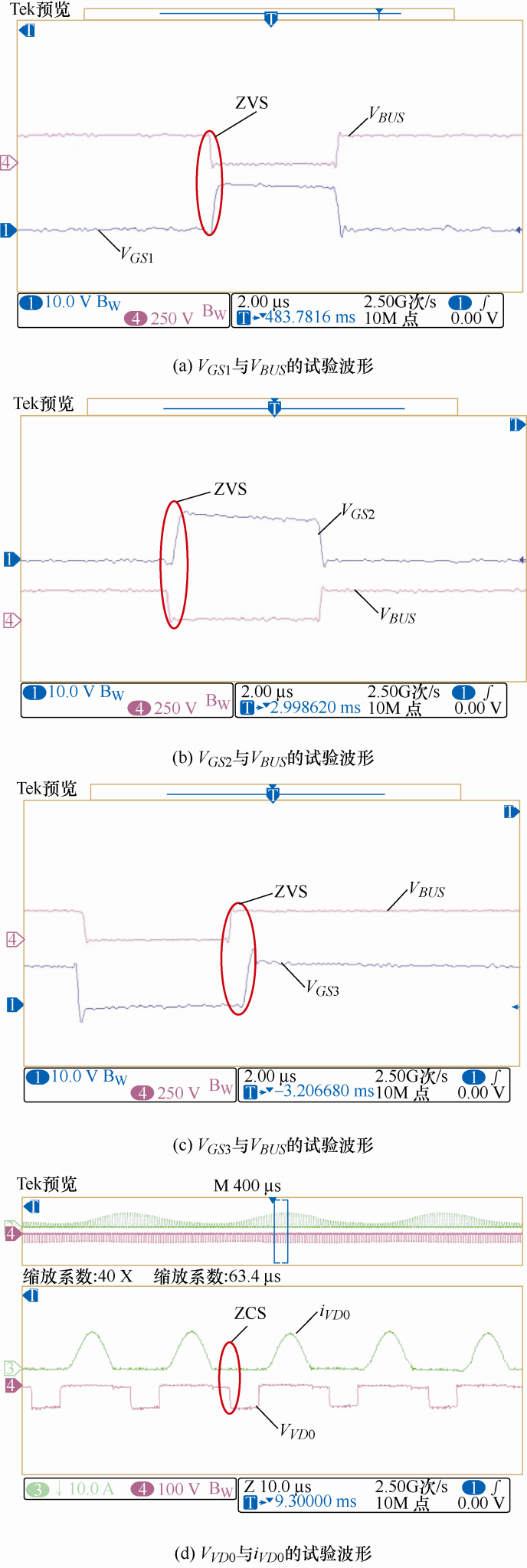 图9a~9c 分别为Vrms =115 V时开关管S 1 、S 2 和S 3 的GS 端电压VGS 与BUS点对地的电压VBUS 和副边二极管电压VVD 0 和电流iVD 0 的试验波形。从图9a~9c 可以看出,有源钳位电路很好地抑制了电压尖峰,降低了开关管的电压应力,开关管S 1 、S 2 和S 3 实现了零电压开通,副边二极管实现了零电流关断。