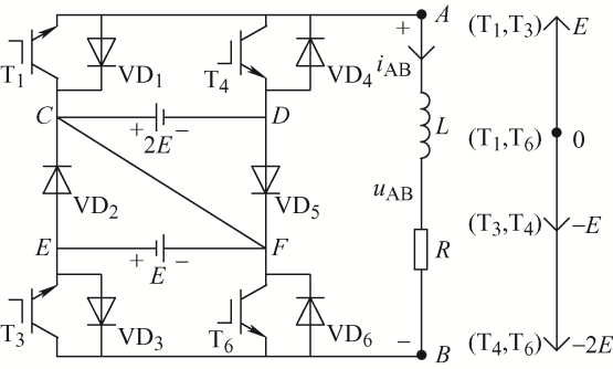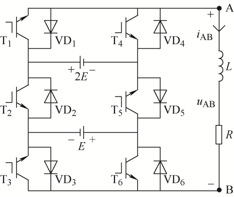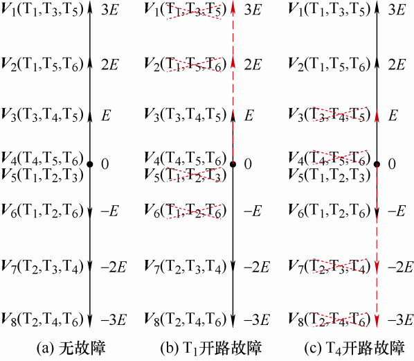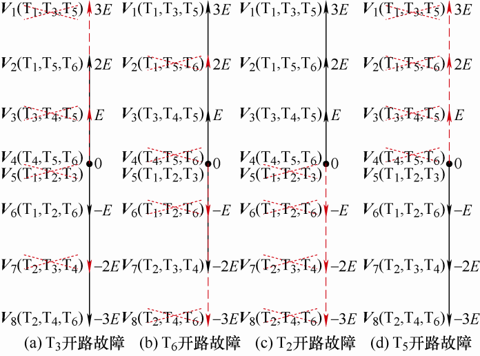 由表2可知,当T1、T3、T4和T6中的某一个发生开路故障时,逆变器均可以输出至少一个正电压、零电压和负电压。即理论上仍可以控制负载电流升高和降低,只是可选择的电压矢量和电平数减少了。