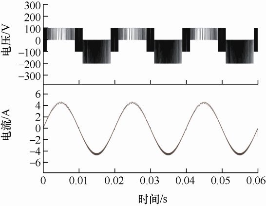 利用Matlab软件进行仿真分析,系统参数设置如下:逆变器直流侧电源为100 V和200 V;输出端电抗器为10 mH,电阻为20 Ω,环宽h为0.05 A。参考电流为幅值4.5 A、频率50 Hz的正弦波。