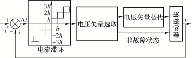 如图3所示,首先利用滞环确定电流跟踪误差Δi=i*-i,然后通过合理选取逆变器电压矢量将跟踪误差降低到滞环范围内。其中i*为参考电流,i为实际电流,滞环宽度为h、2h和3h。非故障状态下的电压矢量由式(1)选择;故障状态下,还需要将原算法选取的电压矢量进行替代,即进行故障容错控制。