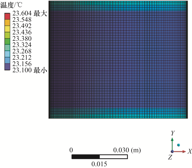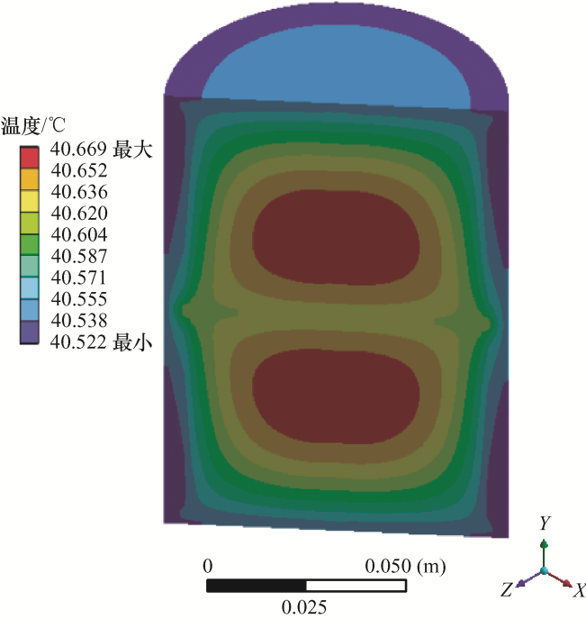 更改电流有效值为2.8 A,环境温度为40 ℃下的电容器温度场分布仿真结果如图8 所示。由式(1)可知,电容器的发热功率与电流有效值的平方成正比。在2.8 A电流下,电容器的最高稳态温升为0.669 ℃,相比于电流为5 A时下降幅度很大。