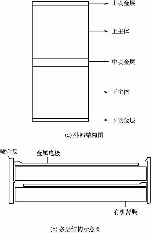 金属化膜电容器元件结构为卷绕型,单个元件呈圆柱形结构如图1a 所示,由两层金属薄膜绕绝缘芯棒卷制而成。金属薄膜蒸镀在有机薄膜上作为电容器极板,在两侧由喷金层引出[12 ] ,使金属化膜电容器具备“自愈”特性,多层结构如图1b 所示。本文所研究的电容器在内部结构上相当于两个电容器并联,连接处为喷金层直接接触,该结构用于提高电容器的工作电压。