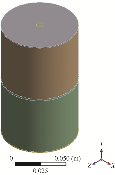 电容器外壳直径为86 mm,高130 mm,厚度1 mm。电容器内部主体由上下两个电容器串联而成,单个电容器直径76 mm,高62 mm。电容器主体两端为喷金层,喷金层直径为76 mm,厚度1 mm,两个电容器之间的喷金层直接接触。由于金属化薄膜电容器是卷绕型结构,内部存在绝缘芯棒。绝缘芯棒直径为7 mm,高为126 mm。主体部分的各个部分由于材料基本相同,将其简化为统一的整体。电容器主体部分为金属电极与介质薄膜的混合介质。由于金属薄膜电极与介质薄膜的尺寸很小,为方便建模,在此模型中将薄膜电极与介质薄膜看成统一的混合介质。