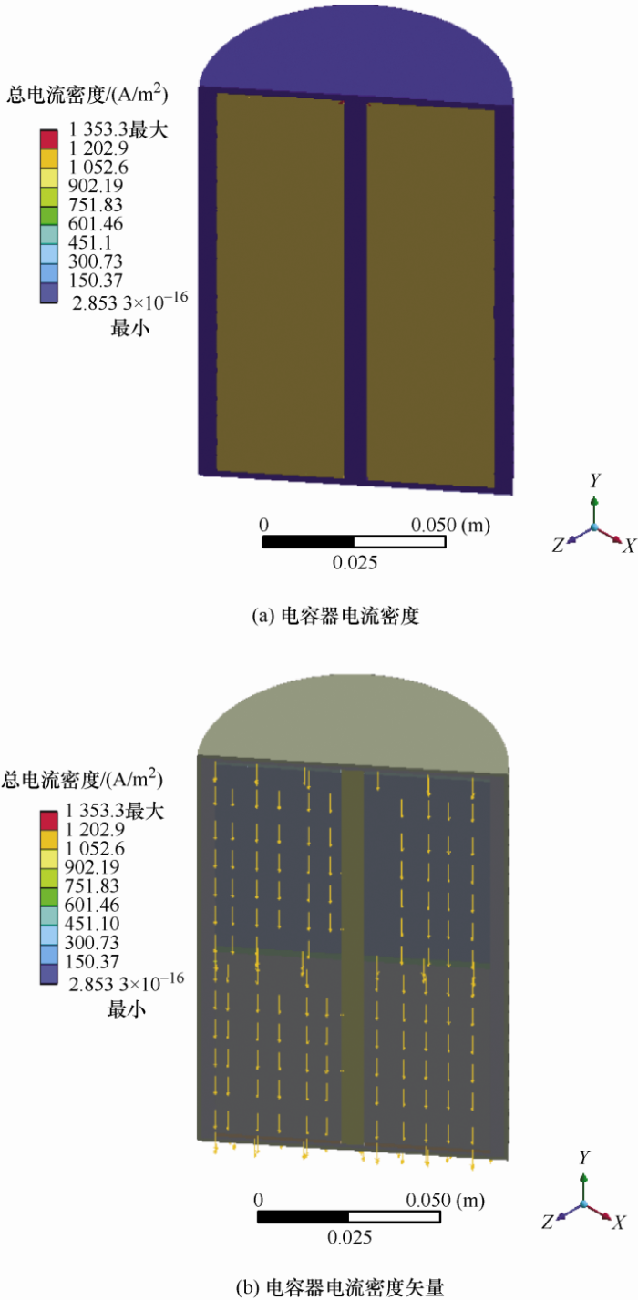 为了计算金属化膜电容器的发热功耗,使用有限元模型对电容器电场分布进行分析。根据电容器实际充放电工况,相关初始条件与边界条件设置如下:① 初始条件:电容器的初始有效电流值与存储电荷量均为0;② 有效值电流为5 A;③ 电屏蔽:电容器上下电极设置电屏蔽,厚度为1 mm。