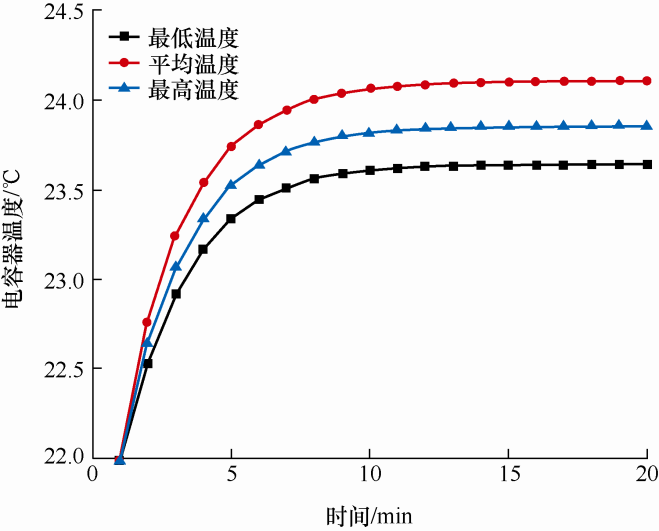 初始环境温度设定为22 ℃,迭代至温度收敛,可得到电容器温升瞬态曲线如图4 所示。结果表明,电容器在环境温度为22 ℃,有效电流值为5 A时,其最大温升约为2.5 ℃,在安全指标内。