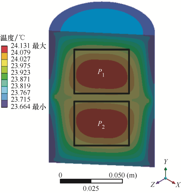 电容器的温度场有限元模型如图5 所示。最高点温度为24.131 ℃,最低点温度为23.664 ℃,温差小于1 ℃。在图1a 中,电容器主体结构分为上下两部分,作为电容器主体材料的金属电极与聚丙烯薄膜的复合介质的导热系数要小于喷金层采用的材料锌,两块主体之间的热量能够更快地散发出去,同时由于存在热传导,热量被不断传到电容器的中心区域,因此温度最高的区域同样分为上下两个部分,对应图5 中P 1 、P 2 区域。