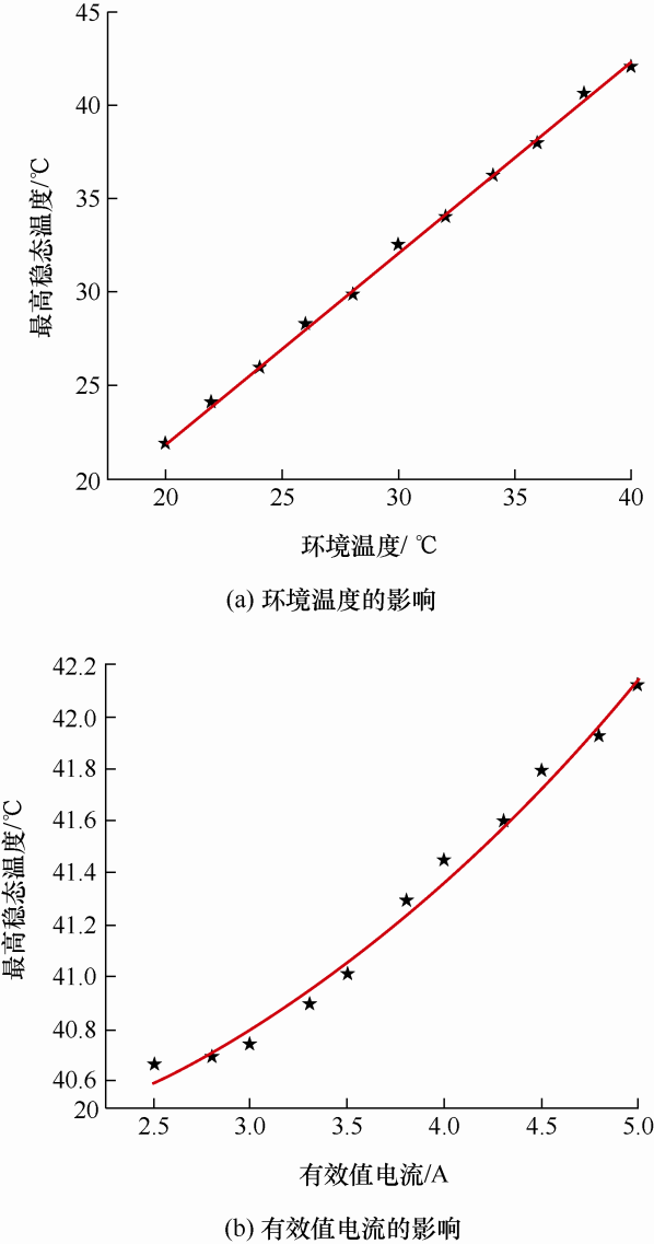 基于电容器的有限元模型分析环境温度和电流有效值对电容器温度场的影响:① 研究环境温度对最热点温度的影响,考虑电流有效值为5 A,环境温度从20 ℃到40 ℃进行扫描,分析金属化膜电容器在不同环境温度下的最热点温度;② 研究有效值电流对最热点温度的影响,环境温度设置为40 ℃,考虑电流有效值从2.5 A到5 A进行扫描,分析金属化膜电容器在不同有效值电流下的最热点温度。金属化膜电容器的最热点温度与环境温度、有效值电流的曲线如图6 所示。