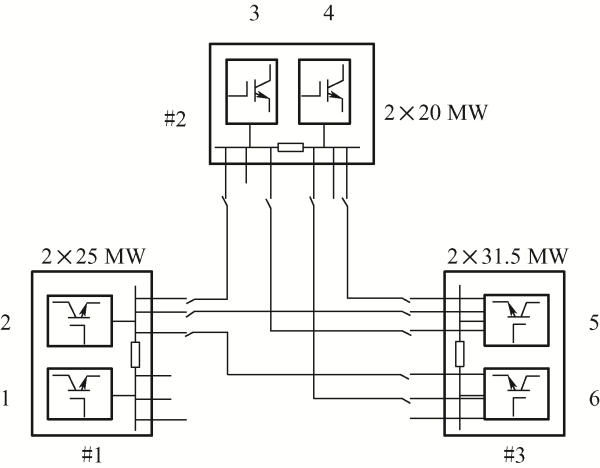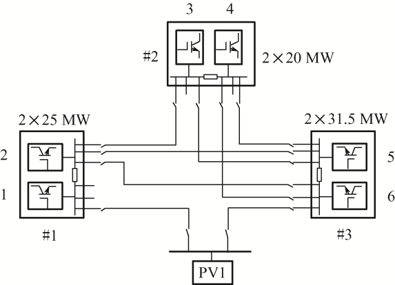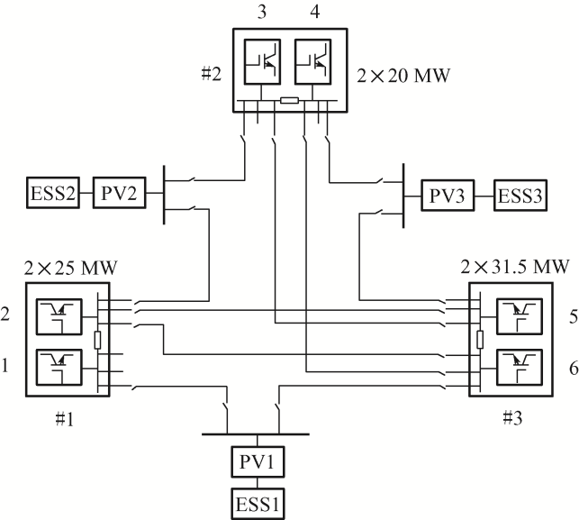 本节研究了一个三端直流配电网络,采用环形拓扑。如图1 所示,该直流配电网共有3个换流站、6个换流器。换流站编号分别为1、2、3,换流器编号为1、2、3、4、5、6,容量分别为25 MW、25 MW、20 MW、20 MW、31.5 MW、31.5 MW。