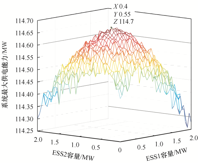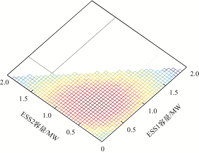 考虑实际光储电站的储能容量配置原则,设定图7 、图8 所示的3个光储电站总储能容量为2 MW时,即P ESS1 +P ESS2 +P ESS3 =2 MW,通过循环遍历计算,得到该直流配电网取得最大供电能力的储能分配情况。由图8 可知,P ESS1 、P ESS2 取值在0.5 MW附近,P ESS3 取值在1 MW附近时,该直流配电网的系统最大供电能力取得最大值。