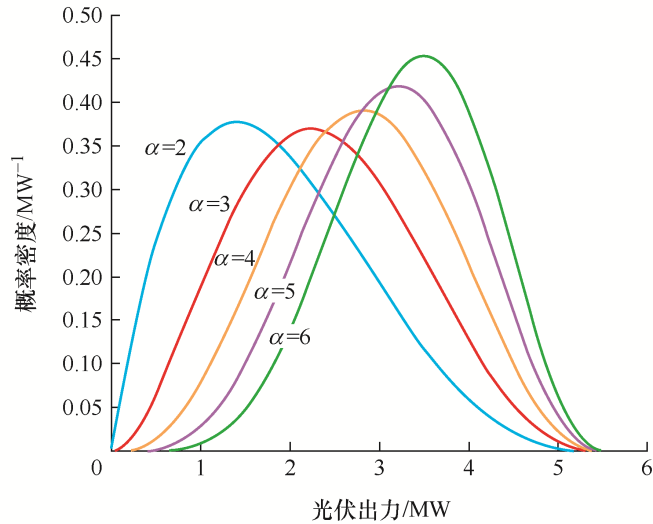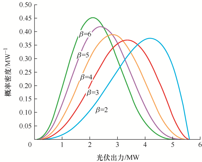 光伏的输出受光强、光电转换效率、光伏板总面积的影响。在一定时间内,太阳光强度近似符合Beta分布。图3 、图4 展示了考虑太阳光强度的Beta分布,在分布参数α 、β 取不同值时,光伏出力的概率密度曲线。可以看出光伏输出功率是随机的,且最大光伏出力P PVmax =5.6 MW。本算例取光伏电站出力为3.6 MW。