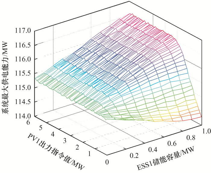 图6 为光伏电站PV1出力指令值及ESS1储能容量分别在一定区间波动时对该直流配电网供电能力的影响。由图6 可知,加入光储充电站后直流配电网的供电能力比无光储电站的情况下供电能力(110.40 MW)有了明显提升。并且在光伏电站出力大于0.6 MW的情况下,在该配电网配置储能容量范围内,储能数值越大,对直流配电网供电能力的提升作用越显著。
