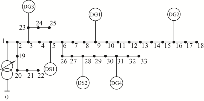 ... 本文采用改进的IEEE33节点系统来进行仿真,其原有的线路参数不变,改进后的系统如图1 所示.在此节点系统中,基准电压为12.66 kV,基准功率为10 MV·A.系统中电压的约束范围为0.95~1.05 p.u.[18 ] .0号与1号节点安装有载变压调压器,其调节范围为±4×1.25%.在5号和28号节点连接静止无功补偿器,其无功出力范围0~500 kVar.在9号、16号、23号以及31号节点安装DG,包含风力发电以及光伏发电. ...