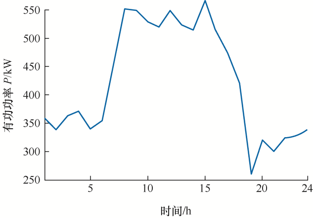 ... 风电机组的有功额定容量为400 kW,无功出力范围为-140~180 kVar.光伏机组的有功额定容量为300 kW,无功出力范围为-100~120 kVar.风力发电的出力情况是以基于组合损失函数的BP函数来预测,使用预测日的NWP数据,经过训练得出最小误差的预测出力曲线,本文采用了层数为5-4-1的BP神经网络结构,其隐含层和输出层的传递函数分别为tansig函数和purelin函数,学习率设置为0.001,联合损失函数的权重系数为1,1,0.001,并以平均绝对误差和均方根误差来反映预测值的误差情况[19 ] ,如表1 所示.光伏发电的出力是以标准日的光照水平得出的预测出力曲线.将两者结合得出DG的有功出力曲线,如图2 所示. ...
