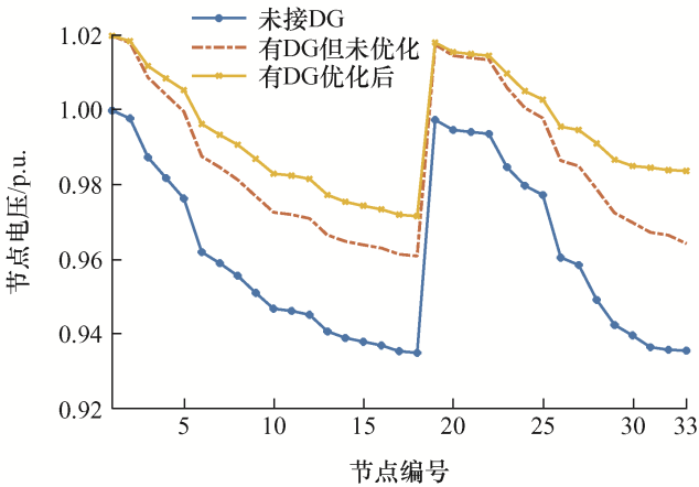 (2) 当考虑DG的无功出力时,可进一步减少系统的有功网损,降低配电系统的运行成本并提高系统的电压水平,系统的整体性能得到了提高。