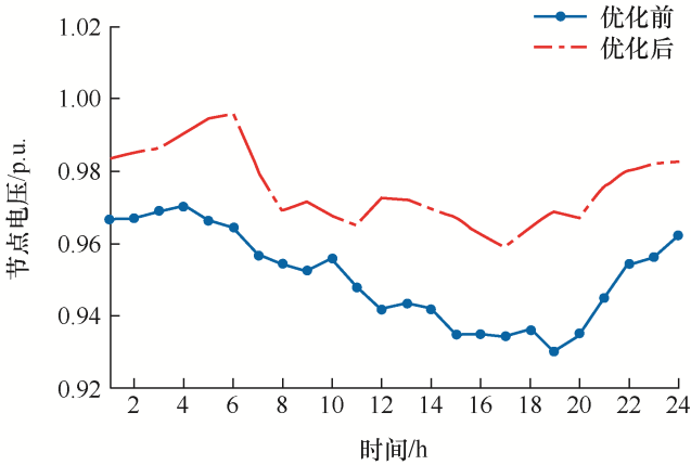 由图5 可以看出,在优化前,33节点在重负荷的情况下电压水平基本都低于电压下限,而在优化之后,33节点的24 h电压都在安全运行的区间之内。可以得出,当考虑DG的无功出力时,可以保证配电网系统节点的全天安全运行。
