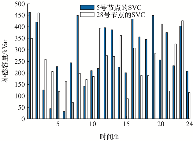 静止无功补偿器是现代技术较成熟的FACTS设备,常用于电力系统的负荷优化以及配电系统优化。它没有采用大容量的电感器以及电容器来生成需要的无功容量,而是采用电力电子器件来实现,这是无功补偿技术的巨大进步,它的动态无功优化与以往的电容器组投切相比更加灵活,并且可以对扰动产生较快的反应[20 ] ,由于其不需要投切的变化,所以运行成本也会更低,图6 为两个静止无功补偿器优化后的24 h补偿容量曲线。