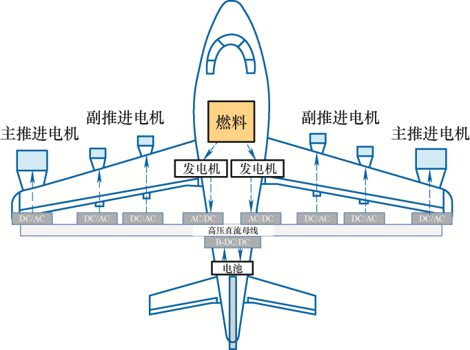 传统飞机发动机产生的能量主要用于飞机飞行推力、航空电子设备供电等目的,近年来,由于全球环境保护和绿色航空的要求,飞机机载设备用电功率需求快速增加带来了多电化和全电化需求。继飞机二次能源逐步统一为电能形式,从而形成多/全电飞机之后,未来电推进技术成为飞机动力系统电气化的重要发展方向[1 ] 。与传统发动机推进系统相比,分布式电推进系统具有更高的效率和功率重量比。在实现飞机电推进技术全电化之前,目前由于电池等储能装置有限的能量密度,涡轮电推进技术是一个可行方案。因此,利用飞机发动机和推进电机之间的协同作用来改善飞机整体飞行性能的混合分布式电推进系统被提出[2 ] ,有望进一步简化飞机能源动力系统结构,提高飞机动力系统能量转换效率,降低燃油消耗和排放,该技术代表了航空电气化的高级发展阶段。