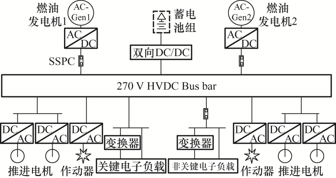 (1) 混合电推进飞机系统存在用电负载功率的大范围变化,且机载电力系统功率容量相比较于推进功率的变化需求,其能量裕度并不大。