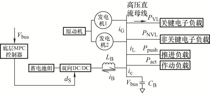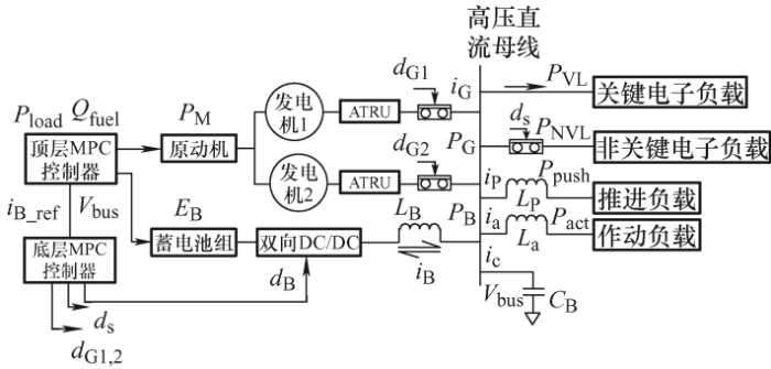 根据以上的控制器系统的基本结构设计了基于分层MPC的能量管理架构,如图5 所示,机载多脉波自耦变压整流器(ATRU)将交流电压115 V/400 Hz从同步发电机转换为270 V高压直流电压,输出到高压直流汇流条;双向DC/DC变换器通过滤波电感连接到蓄电池系统;负载侧驱动涵道风扇和作动器的电机均为感性负载,由等效电感表示,而机载用电设备电子负载等效为恒功率负载;图5 中所有功率变换器滤波电容器集中在一起,由一个等效电容表示,以便于电力系统建模。顶层MPC提前计算飞机电源系统功率配置,主要是主发电机组和蓄电池组的功率设定点,低层MPC控制连接到蓄电池组的双向功率变换器控制端,其产生占空比命令和主发电机组控制信号、连接非关键负载的固态功率控制器(SSPC)开关信号。根据电源系统的功率设置点,顶层MPC向低层MPC发送电流参考值,这可能随着时间的推移而变化。这是MPC两个层次之间的连接点,通过这个连接点,较高层级的MPC可以影响到较低层级的MPC控制器。