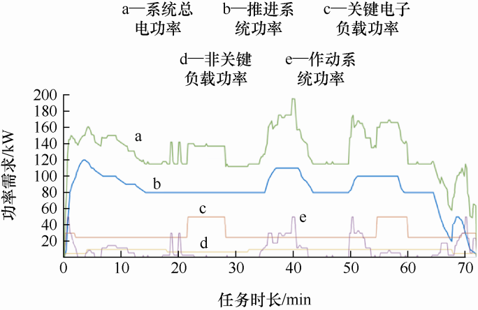 根据一般电推进飞机的负载变化形式将其负载类型分为四类:功率需求较大但变化率较小的推进系统载荷,功率需求不大但变化率较大的作动系统,功率需求较大和变化率也较大的关键电子负载,功率需求较小变化率也较小的非关键电子负载。图3 显示了典型混合电推进飞机的负载任务剖面图。