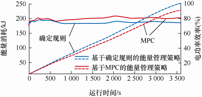 给出的状态变量是电池组动态电流i B 和直流电容电压u C ,决策变量是双向DC/DC的占空比控制命令d B 。值得注意的是,控制矩阵中的电池组端电压u B (k )是随系统变化的变量,根据电池组的SOC估计得到或直接测量得到。