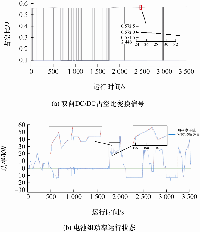 底层模型预测控制器用于混合动态电源主要是电池组的管理,电池组充放电时,两端的电压随着电池组SOC的变化而变化,所以对于双向DC/DC的控制是随着电池组能量变化而变化的,而决策主要是双向DC/DC变换器的占空比信号d B ∈(0,1),使电池组输出端的电压稳定在母线标准电压处,所以电池组的作用不仅是作为系统能量管理的一部分,还承担着在负载能量波动时维持母线电压的目的。底层的系统控制架构如图7 所示。