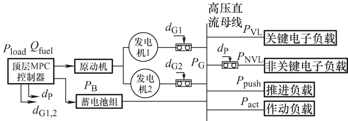 其主要控制变量被分成两类。一类是电推进飞机电源系统的功率输出决策,燃油发电机组的消耗燃油的能量输入P M ,电池组的充放电模式的能量状态P B ;一类是发电机组投切状态d G1 、d G2 和负载侧主要是非关键电子负载的屏蔽状态信号d s ,这部分的控制量大多是开关量信号,即0,1逻辑控制信号。