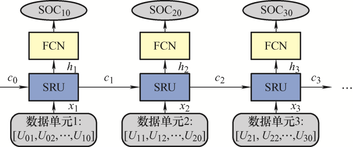 为此,本文采用深度学习方法中的简单循环单元(Simple recurrent unit,SRU)来实现对电池SOC和SOH的联合估计。首先,建立基于SRU的电池SOC估计模型;接着,使用含有电池老化信息的样本数据来对模型进行训练;最后,通过对该模型输出的SOC估计值中所隐含的老化信息进行挖掘,从而完成电池SOC与SOH的联合估计。