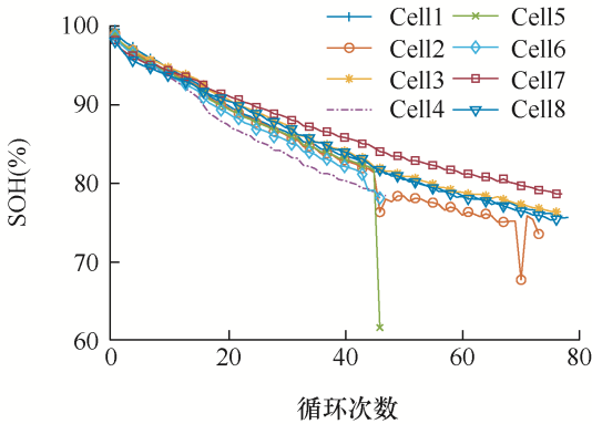 图6 展示了测试电池的SOH变化曲线,可以看到随着循环次数的增加,这些电池的SOH都会有所下降。图1 展示了电池Cell1在不同SOH下的SOC曲线。一般来说,当电池SOH下降至80%时即可认为其寿命终止[23 ] ,本文为了验证所提估计方法的可靠性,使用电池在全生命周期下的测试数据来进行试验。