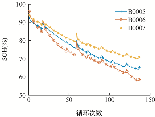 考虑到这三块电池的放电截止电压有所不同,为了保证在计算电池实际容量Cm 时标准的统一,规定2.7 V为三块电池统一的放电截止电压。图7 展示了其SOH的变化曲线。