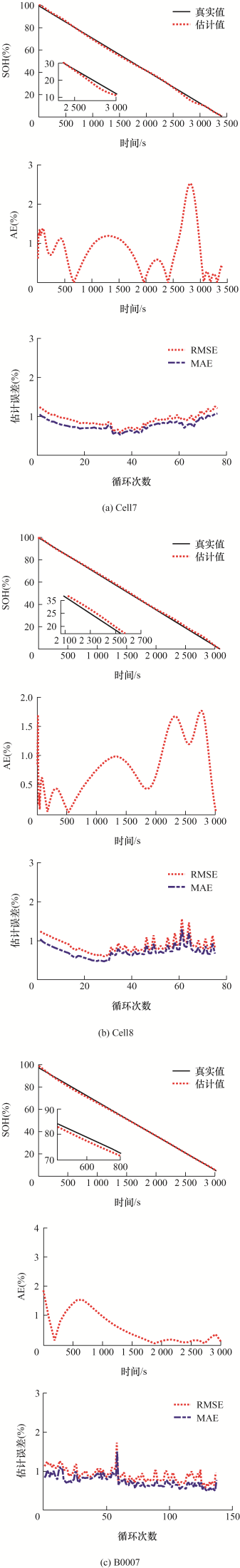 按照表1 分别在两个电池数据集上对SOC估计模型进行训练与测试。训练好的模型在两个数据集上的SOC估计结果如图8 所示,图8 中包括了电池在特定SOH下的SOC估计结果(电池Cell7在SOH为95%时的SOC估计曲线及AE曲线、电池Cell8在SOH为85%时的SOC估计曲线及AE曲线、电池B0007在SOH为90%时的SOC估计曲线及AE曲线),以及SOC估计模型在3块电池上估计误差RMSE和MAE随循环次数增加而变化的曲线,其中RMSE和MAE由每一次循环下的SOC估计结果计算所得。