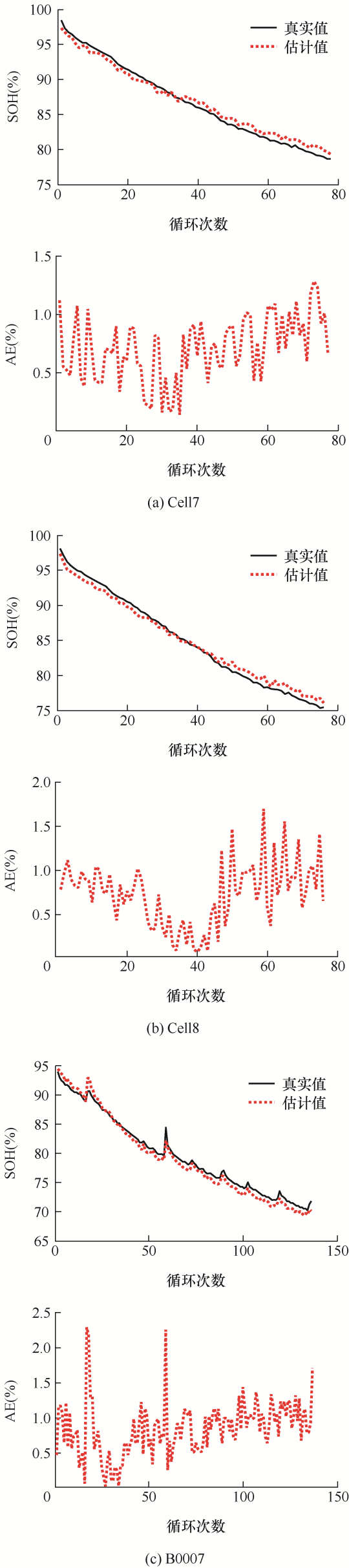 图9 展示了将训练好的SOC估计模型应用于联合估计方法后,在三块电池上的SOH估计曲线及AE曲线。其中,图9a ~9b是所提联合估计方法在牛津电池数据集上的估计结果,可以观察到电池Cell7和Cell8的SOH衰退速率有着较为明显的差异,SOH下降至80%所经历的循环次数有着明显的不同,这种电池之间的不一致性也对SOH估计方法的可靠性有了更高的要求。但是该联合估计方法可以克服这种电池不一致性带来的影响,它在两块电池上SOH估计值均能有效地收敛于真实值,SOH估计的绝对误差基本在1.5%以内,表现出了较高的估计精度。图9c 展示了联合估计方法在NASA电池数据集上的估计结果,可以看到电池B0007的SOH衰退曲线上存在较为明显的容量增生现象,曲线的波动起伏较为剧烈,这势必会给SOH估计方法带来不小的挑战。但是所提方法基本不受这一现象的影响,SOH估计值仍然有较高的估计精度,估计绝对误差基本限制在2%以内。这一结果也表明,所提联合估计方法对不同种类的电池也有良好的通用能力。