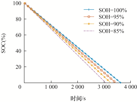 由式(3)可见,电池的SOC与SOH之间存在较为紧密的联系,SOC的准确估计需要考虑电池当前SOH的影响。为了更加直观地展示这一影响,在图1 中展示了电池在不同SOH下的SOC曲线,可以看到即使都是恒流放电工况,它们之间也有着较为明显的差异,电池SOH越低,SOC曲线的斜率就越大,放电过程也就越早结束。因此,为保证电池SOC估计模型在训练过程能够学习到关于电池老化的信息,本文在后续试验中制作电池SOC标签时均按照式(3)来计算。