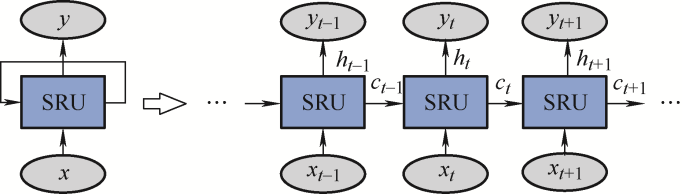... SRU[19 ] 是一种较为新颖的循环神经网络(Recurrent neural network,RNN),其计算过程如图2 所示,可见其在每一时刻的输入都与之前时刻的状态信息存在着紧密联系.为解决传统RNN在处理长序列时出现长期依赖的问题,SRU的内部设有门控结构来调整信息的流向.相较于流行的RNN变体,如长短时神经网络(Long short-term memory networks,LSTM)和门控循环单元(Gate recurrent unit,GRU),SRU在进行训练的过程中能将大部分计算并行处理,仅保留了必要的串行计算,因此它具有更快的训练速度.同时,SRU与LSTM和GRU的性能相近,甚至能够通过叠加隐藏层的层数来获得更为优秀的性能.SRU的内部结构如图3 所示. ...