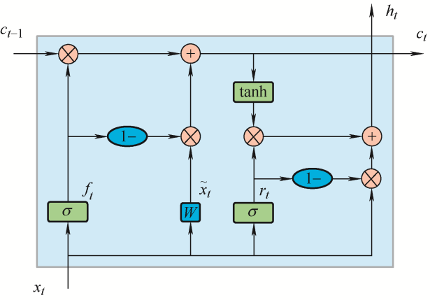 (4) x ˜ t = W x t f t = σ ( W f x t + b f ) r t = σ ( W r x t + b r ) c t = f t ⊙ c t − 1 + ( 1 − f t ) ⊙ x ˜ t h t = r t ⊙ tanh ( c t ) + ( 1 − r t ) ⊙ x t