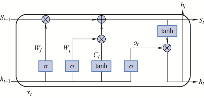 式中,W 和b 是LSTM单元的参数;St 是当前单元状态;Ct 是新单元状态St 的候选值;ot 表示输出门;ft 表示遗忘门;it 表示输入门。